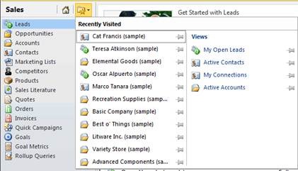 Have you ever been annoyed by the fact that when you switch between entities you always get presented with the default view, which isn’t necessarily what you wanted? Not any more! In CRM 2011 you can chose and open any view without having to open the default view first. From the sitemap menu, which you can open by clicking on the little arrow that appears when you mouse over the name, you can now pick the view you want to open directly. Or you can choose other options from the right-click menu such as opening it in a new window or copying/e-mailing a link.