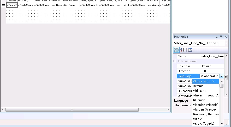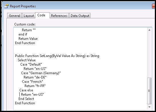 Now in the RDL reportlayout we see datafield “Lang” in DataSet. It value could be the same as we set in option string, but ATTENTION: we can’t directly fill this value to property Language. So it is French we need to assign “fr-FR”; is English (US) then “en-US”; if German (Germany) then “de-DE”