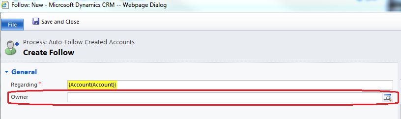 Since you want yourself to auto-follow accounts that are created, find and pick yourself in the look-up. Save and Close.