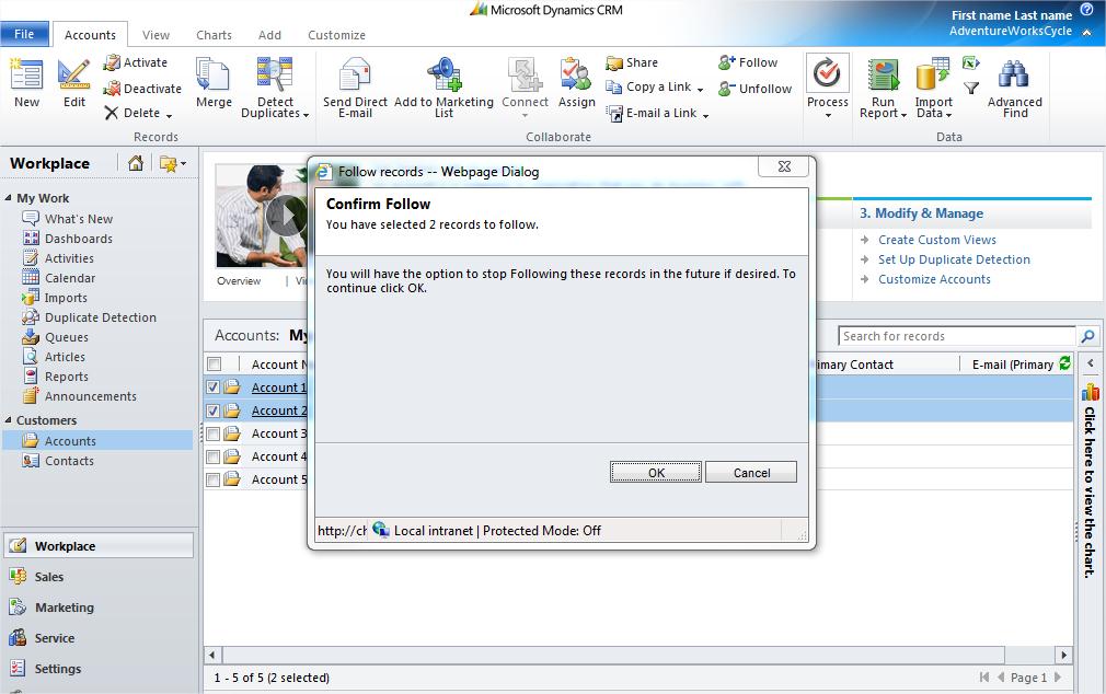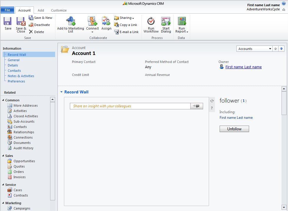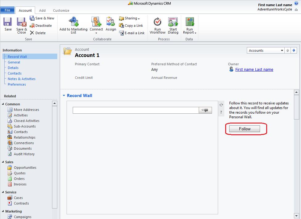 With the inclusion of Activity Feeds in the latest CRM update, we introduce the concept of “following” records. When you follow a record, you will see updates related to that record appear on your Personal Wall.