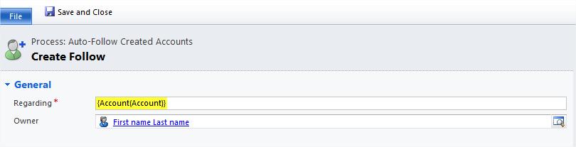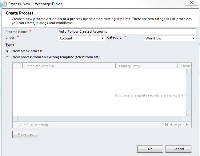 First of all, go to Settings à Processes à New in order to create a new workflow. Enter a name and choose Entity == Account, Category == Workflow.