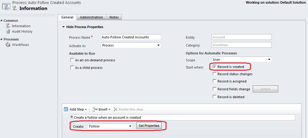 The default option is to have the workflow “Start when” the record (the account) is created and that’s what we want so we leave that setting alone. Add a new step that creates a Follow and click Set Properties.