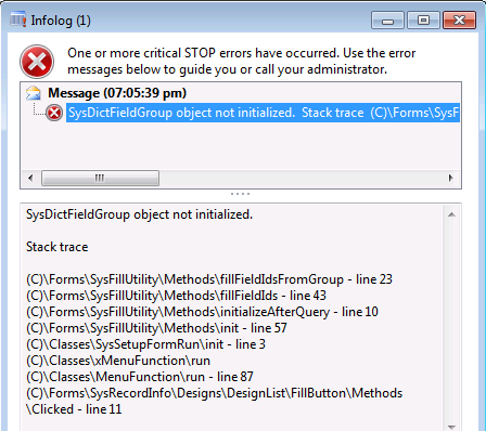 This error is caused by the fact that the AutoLookup Field Group of the table (the table that the field belongs to that he wants to change) does not exist. The Field group is shown in the AOT as it is semi-created when the table is created, but it does not actually exist as field group until a field has (or had) been added to it.