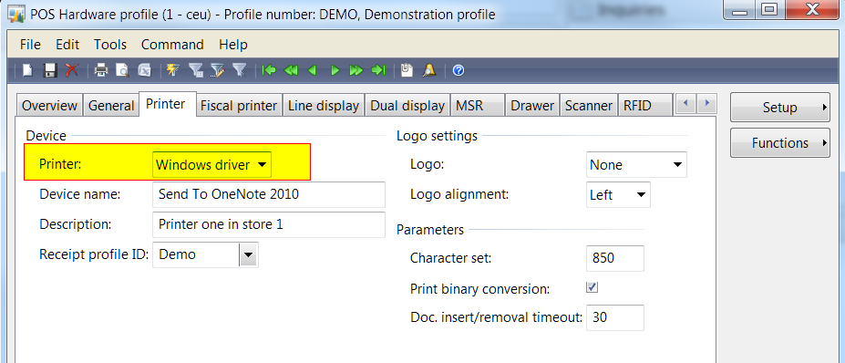 When this code gets hit, the receipt has already been created in memory and is ready to send to the printer. The decision to send to an OPOS printer (OPOSPrinting method) or a Windows printer (WindowsPrinting method) fully depends on the setting on the Printer tab of the POS Hardware Profile window: