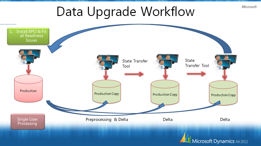 To find out how to use the upgrade state transfer tool, see Using the preprocessing upgrade state transfer tool or obtain the Microsoft Dynamics AX 2012 Upgrade Guide (http://new-cm-edgedigital.pages.dev/download/en/details.aspx?id=14599) from the Microsoft Download Center and search in the file for the section titled “Using the pre processing upgrade state transfer tool.” Read through the entire section carefully for detailed information on how to setup the live production system and the test system to support running this process.
