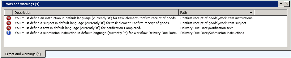 You will see errors similar to those in the screenshot below, stating that text must be defined in the default language before the workflow is valid.
