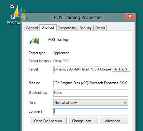 We recently had a scenario where a customer wanted to be able to start the POS in training mode directly from an shortcut instead of having the user go in and select training mode from the menu. They would then have two icons for POS: one for “live” operation and one for training. Usually this would entail using a command-line parameter to represent whether training mode would be set or not and then creating the shortcut with that parameter.