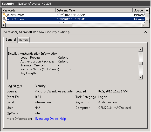 Authentication events are logged in the Security event log, which you can review by using the Event Viewer (Start, Run, ‘eventvwr’). The differences between NTLM-related security events and Kerberos-related security events are evident in a comparison of the following illustrations: