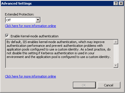 3. In the Advanced Settings dialog box, if the Enable Kernel-mode authentication check box is selected (which it is by default), then the deployment is using kernel mode authentication.