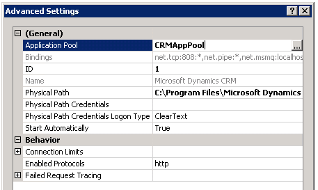 3. In the Advanced Settings dialog box, under (General), note the value to the right of Application Pool (the default name of the application pool is ‘CRMAppPool’), and then close the Advanced Settings dialog box.