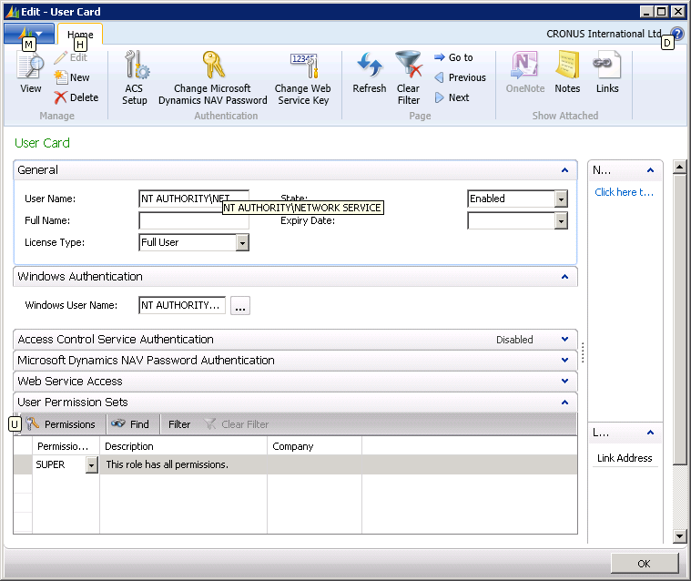 NT AUTHORITY\NETWORK SERVICE created as a NAV user and assigned the SUPER Permission set: