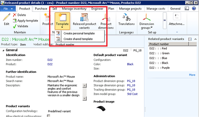 Also, the system allows you to modify the shared product template from the Product details form. This makes it easy to identify all the fields that you want to change.