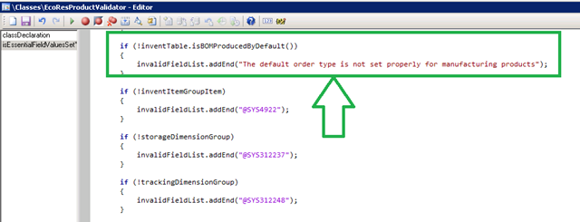 Assume that we need to make sure that all items are produced with a production order for the current manufacturing company. The existing EcoResProductValidator can easily be extended to accommodate such a validation check: