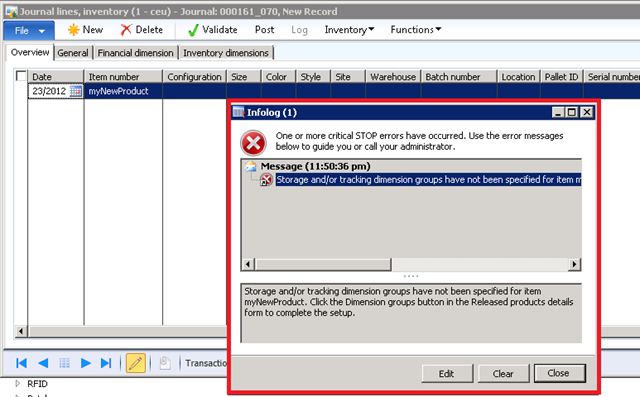 A user creates an inventory movement journal. The system tries to retrieve all inventory dimensions that should be tracked for the product. If the setup is not complete, the process will fail since the basic pre-requirements are not fulfilled.