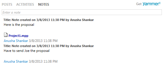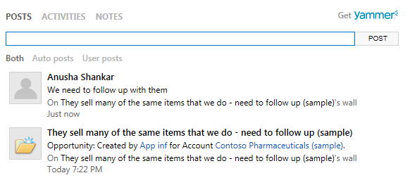 The posts tab is the first tab in this control and it shows both the user posts and the auto-posts associated with this particular record. If the org has signed up for an associated Yammer enterprise account, then this shows user posts from Yammer and auto-posts from Activity Feeds.