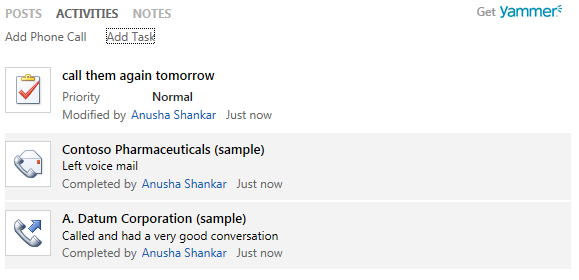 The activities tab is the second tab in the collaboration control and it displays the activities associated with this record. You can quickly add a phone call and add a task via this control. With this control, you don’t have to go to the related activities grid just to look at details.