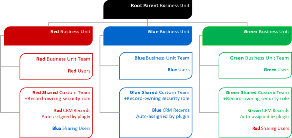 So you configure your CRM organization with three business units — let’s called them Red, Blue and Green — each under the root parent business unit. And you configure the security roles with business unit-level privileges. So far, so good.