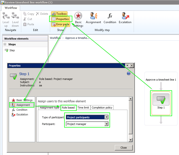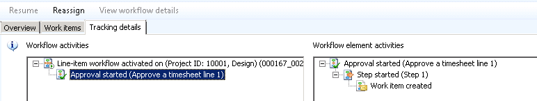 - Timesheet line-item workflow: It is used to define the approval at the detail line level. In such case, you should set up a new workflow of type Review timesheet line workflow and join the new workflow to this workflow element belonging to the main workflow type Review timesheet workflow.