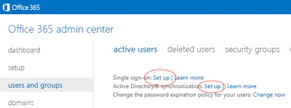 So, what are the requirements for a DirSync computer? To get started you will need an Office 365 subscription, an Active Directory forest, a directory synchronization computer that meets these prerequisites. For complete details about DirSync prerequisites, installation, and use, see the DirSync Roadmap or follow the “Set up” links that appear on the Office 365 Admin Center, as shown in the following graphic: