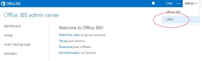Step 2: After the group is synchronized to Office 365, log in to the Office 365 Admin Center as an administrator and then from the Admin menu, select CRM, as highlighted in the following graphic: