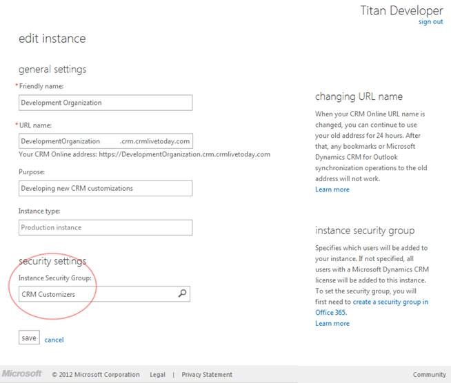 Step 3: Finally, edit the development organization instance in the CRM Online Instance Picker to use your Active Directory security group, as highlighted in the following graphic: