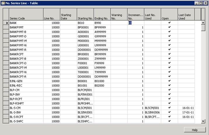 The sequence definition is found in table 309 – No. Series Line. Contains the explicit definition of the series, for example a series called BANK, could start with BANK001 and increase incrementally by one, in the sequence BANK001, BANK002, BANK003, …. Until the last number BANK999. When hitting the number BANK990, the user will receive a warning that the series is about to be exhausted and it must either be increased, or a new series should be assigned.