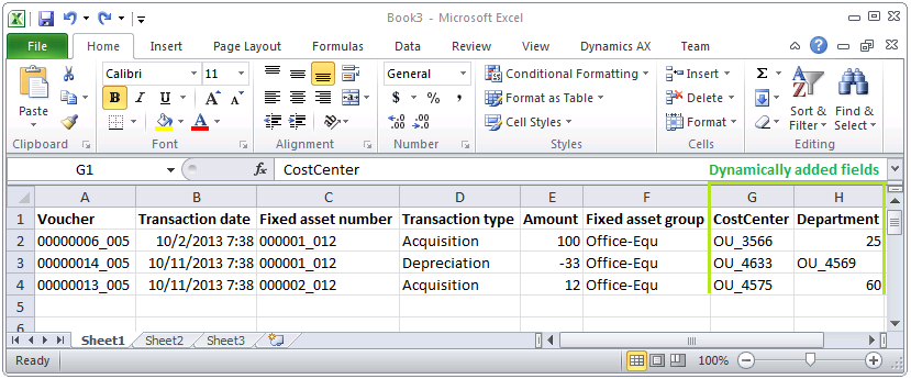 Solution: The following code was proposed that exports all fixed asset transactions to an Excel file together with all dimensions. Because the set of dimensions can be different on different transactions, we’re adding dimension columns dynamically in the loop.