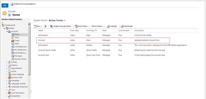 • Go to customizations, activate the updated main form for ‘Account’ .Open the form editor of the updated form in ‘Active Forms View’.
