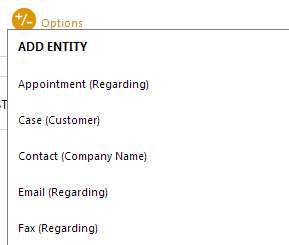 You can add a new entity to the existing process by clicking on options. You’re greeted with a flyout that looks like Screenshot 3.