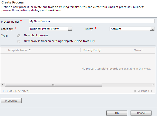 When you create a new process, you’re greeted with a dialog as in Screenshot 1. Once you chose BPF as the category, and since BPF does not use templates, the radio button and grid at the bottom is disabled.