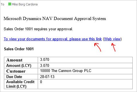 The first link opens the approval document in the Microsoft Dynamics NAV Windows client. The second link (Web view) opens the same document in the Microsoft Dynamics NAV web client.