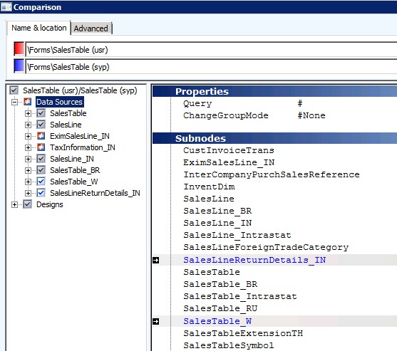 With Dynamics AX 2012 R2 RTM release and Cumulative Update 6 release, an issue with the X++ compiler created phantom Data Sources nodes on several objects within the AOT. The three forms listed above were common examples where the phantom Data Source nodes got created. There was no difference between the phantom USR layer information and the original code so it is possible that this scenario has gone unnoticed within the user’s system. An example of how this type of scenario might appear in the user’s AOT and Compare windows would look like this after CU7 has been installed: