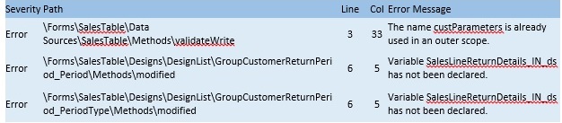 With the release of Cumulative Update 7 (CU7) for Microsoft Dynamics AX 2012 R2, users upgrading from a previous Dynamics AX 2012 R2 version may experience compiler errors on a few forms which were not intentionally modified in the previous version. These compiler errors may appear on the following forms – SalesTable, SalesQuotationProjTable, and SalesQuotationTable. A few examples of the errors are given here for reference: