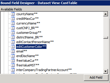 - From the Bound Field Designer – Dataset View: CustTable window locate “editCustomerColor**” within the Available Fields frame.