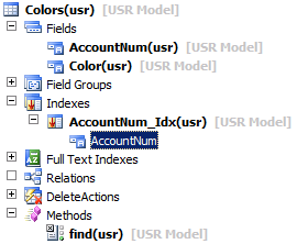 - Locate the “AccountNum” Extended Data Type and drag it to the Fields node of the Colors table.