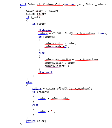 I want to assign specific colors to our customers. The color will help our sales representatives determine what industries they are in. We need to create an associated Colors table which contains the Accountnum and Color fields. We want to give the data entry personnel the ability to add/edit this field from within Enterprise Portal. We would like to do this using an edit method.