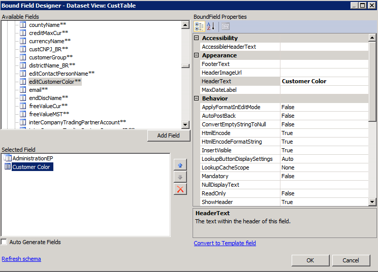 - Highlight “editCustomerColor**” in the Selected Field frame and under BoundField Properties set the HeaderText to “Customer Color”