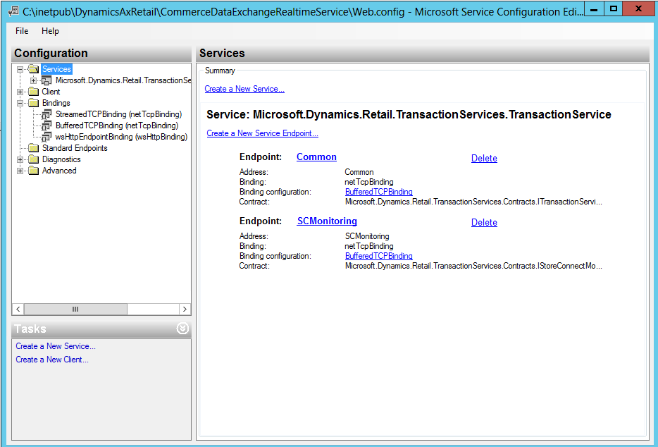 | <?xml version=”1.0″ encoding=”utf-8″ ?> <configuration> <configSections> <section name=”AxRetailPOS” type=”LSRetailPosis.Settings.ConfigFile.AppConfiguration, SystemSettings, Version=6.2.0.0, Culture=neutral, PublicKeyToken=31bf3856ad364e35″ /> </configSections> <AxRetailPOS OfflineDatabaseConnectionString=”” StoreDatabaseConnectionString=”Data Source=AX2012R2A;Initial Catalog=RetailSeattleStore;Integrated Security=True;Persist Security Info=False;Pooling=True;Encrypt=True;TrustServerCertificate=True” StoreId=”SEATTLE” TerminalId=”SEATTLE-1″ DATAAREAID=”usrt” /> <system.diagnostics> <sources> <!– this registers the listener with traces from a specific source –> <source name=”RetailNetTracer” switchValue=”All”> <listeners> <add name=”RollingXmlWriterTraceListener” /> </listeners> </source> <source name=”RetailNetTracerEventLog” switchValue=”All”> <listeners> <add name=”EventLogTraceListener” /> </listeners> </source> </sources> <!– this defines a listener –> <sharedListeners> <!– initializeData is the file name. If empty, it is going to be created in %TEMP%\RetailLogs\<name of exe> –> <add name=”RollingXmlWriterTraceListener” type=”Microsoft.Dynamics.Retail.Diagnostics.RollingXmlWriterTraceListener, Microsoft.Dynamics.Retail.Diagnostics” initializeData=”C:\logs\pos\” MaxLogFileInBytes=”50000000″ traceOutputOptions=”ProcessId, DateTime, LogicalOperationStack” /> <add name=”EventLogTraceListener” type=”System.Diagnostics.EventLogTraceListener” initializeData=”Dynamics AX Retail” /> <system.serviceModel> |