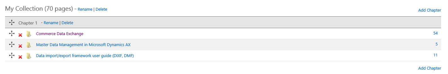I’ll walk through a couple examples: creating a PDF of the Retail Commerce Data Exchange content, and creating a PDF on Master Data Management, which will include all of the AX 2012 R3 content about master data management, some SQL Server content about Master data services, and some AX 2012 R3 content about the Data Import/Export Framework. You can follow the same procedures, but substitute any content that meets your needs.