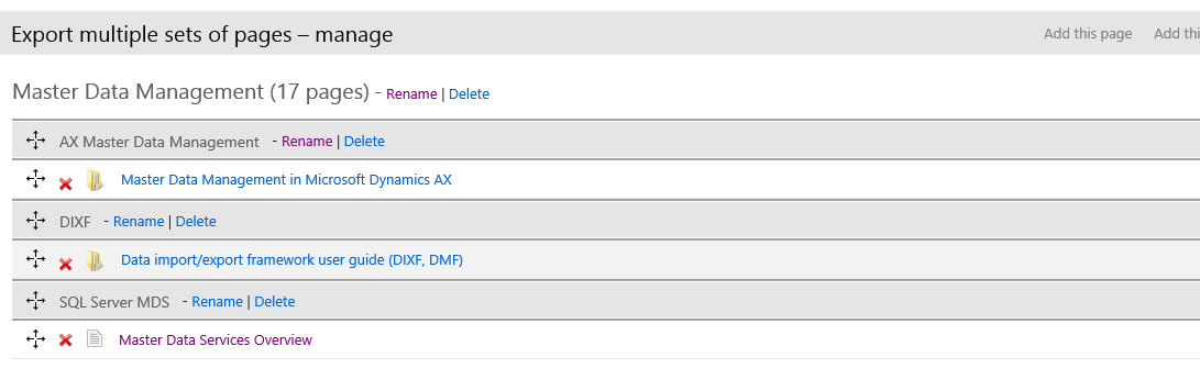 - Navigate to Master Data Management in the AX documentation set, click Export, and the set of pages.