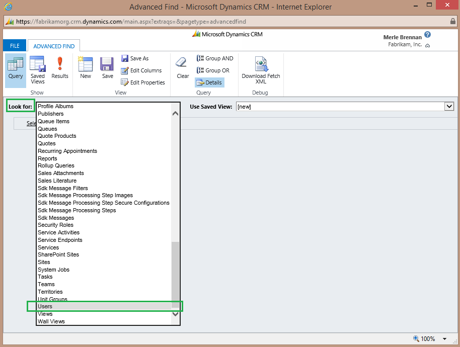 Step 3: On the Advanced Find page, click the Look for: drop down as shown below, scroll down and select Users