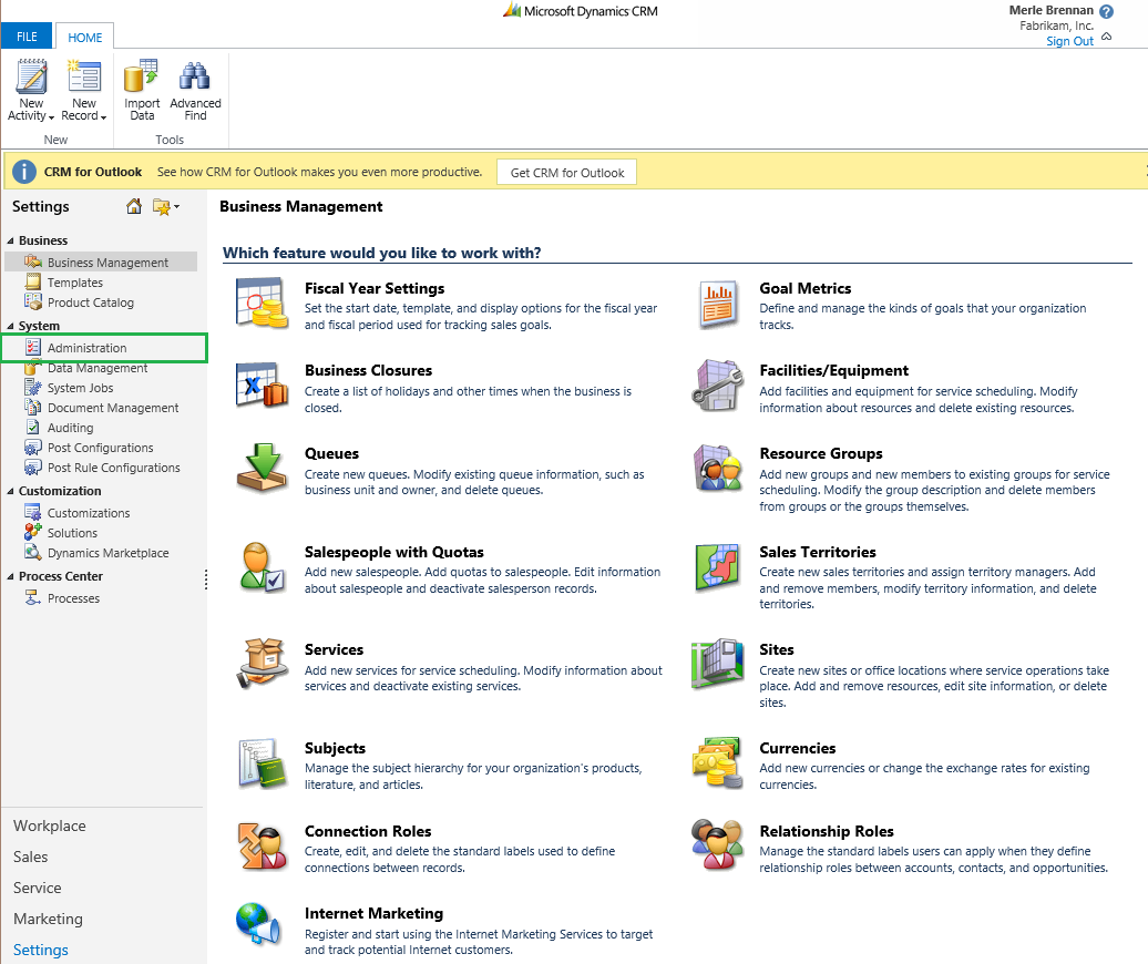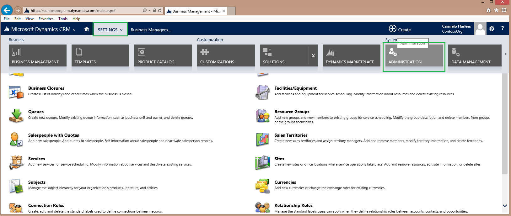 Step 3: On the Settings page, click Settings drop down as shown below. From the given options, click Administration
