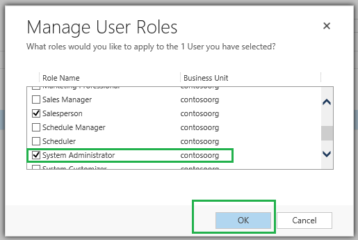 Step 6: On the Manage User Roles page, you will find all of the assigned roles for the selected user(s). Scroll down till you find the System Administrator role, select the role by checking the box next to the role, then click the OK button to save your changes