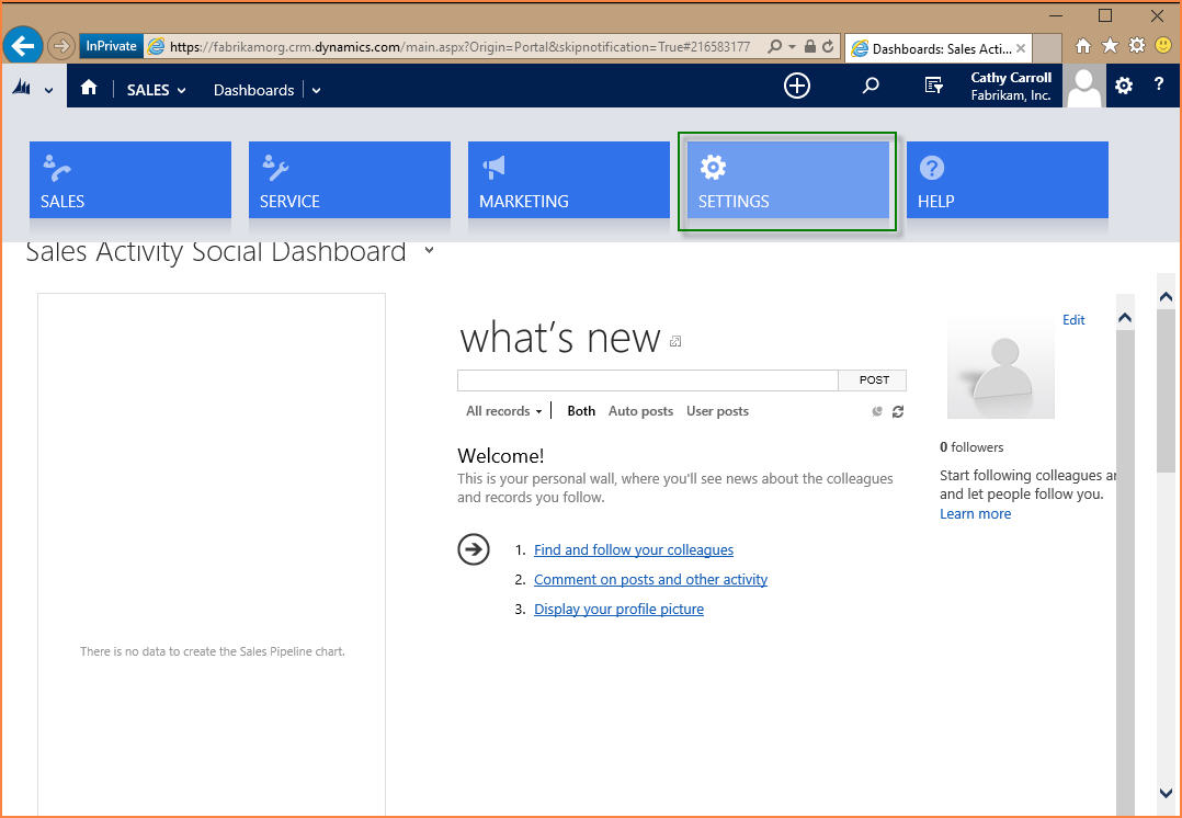Step 2: On the left hand top corner, click the drop down icon (next to the Microsoft Dynamics logo), then click Settings.