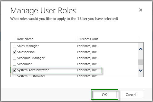 Step 6: On the Manage User Roles page, you will find all of the assigned roles for the selected user(s). Scroll down till you find the System Administrator role, select the role by checking the box next to the role, then click OK button to save your changes