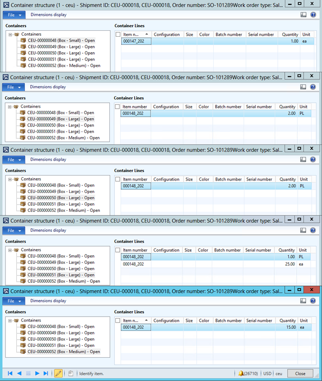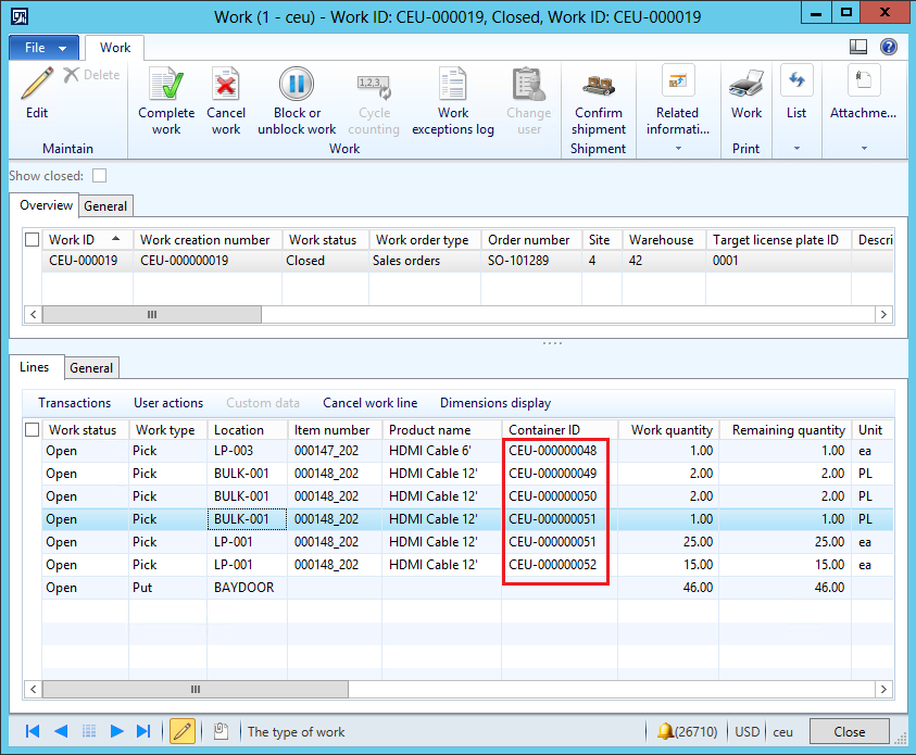 The work lines are broken into quantities that match our container structure, each with the container ID assigned. You may notice that the fourth and fifth work lines belong to the same container. This is because they are for two different sales lines with different units and to be picked from different locations. Based on our configuration, they should still be packed into the same container.
