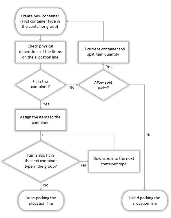 - If length, width, height meet the requirement, the system then checks the weight and volume of the entire items on the allocation line against the maximum allowed weight and volume of the container, taking into account the container utilization percentage set on the container group.