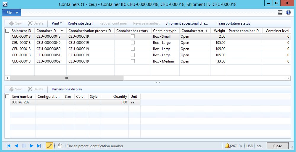 You can also open the Containers form to view all the created containers and related information. Here you can do things such as print container content and view accessorial charges. Compared to the manual packing flow, buttons such as New, Delete, and Reopen appear unavailable in this form for containerization-created containers. Again, this is because we currently don’t support these operations.