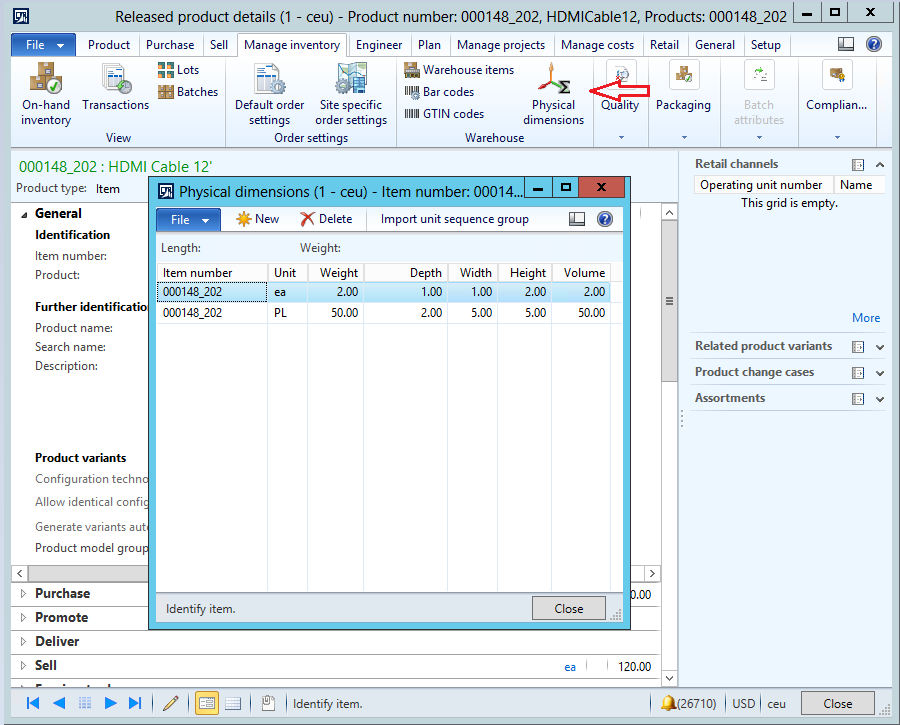 Figure 7. Item physical dimensions (from the Released product form > Manage inventory > Physical dimensions)