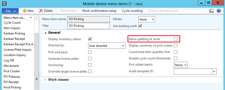 Splitting of work through Mobile device is not supported when containerization is enabled. The Allow splitting of work option allows the warehouse worker to split work line quantities on the mobile device during the execution of work. This is not supported right now. If selected, the mobile user will receive an error and will be prevented from proceeding.
